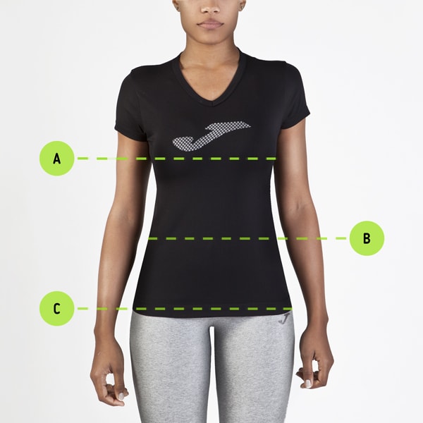 | Talla | Pecho (A) | Cintura (B) | Cadera (C) |